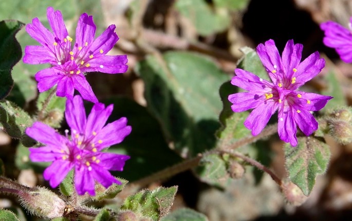 A scientific synonym for Allionia incarnata is Wedelia incarnata. English Common Names for the species include Pink Three-Flower, Pink Windmills, Trailing Allionia, Trailing Four-O’clock, Trailing Windmills, and Umbrella-wort.