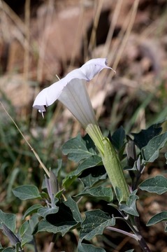 This species contains chemical compounds (tropane alkaloids) which are hallucinogenic. In particular they are deliriant, a class of hallucinogen which cause delirium (as opposed to those which are psychedelics or dissociatives). The indigenous peoples who lived in the range of Datura wrightii used the plant (especially the seeds and roots, where the alkaloids are concentrated) for medicinal and religious purposes. It has also been used as a recreational drug. Use of this plant as a drug is especially dangerous because the concentrations of alkaloids vary with individual plants and the hallucinogenic state is slow to present, making a safe dosage difficult to determine. In addition, the effects are long lasting, include diminished sensory capability (including temporary blindness), and create panic - a rather dangerous combination. During ritual rites of passage practiced by some indigenous tribes, boys were given drinks made from the plant, they sometimes died during the ritual. That should be more than an ample warning for those who want to give it a try - in a knowledgeable environment with active support systems people die when using mixtures created from this plant.