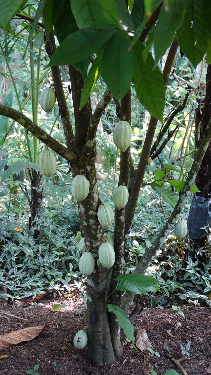 October 26, 2017. Cocoa Trees are native to Central and South America. This species is now grown throughout the tropical world. This species is assumed to be native in southeastern Mexico but probably not in Jalisco. The cocoa beans, found inside the pods, which grow from the stems and trunk of the plant, are ground to produce chocolate, in its various forms. The beans found in about twenty of the pods shown above is required to produce a pound of cocoa paste.